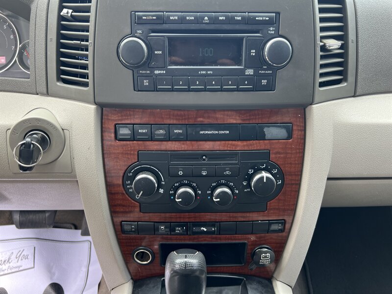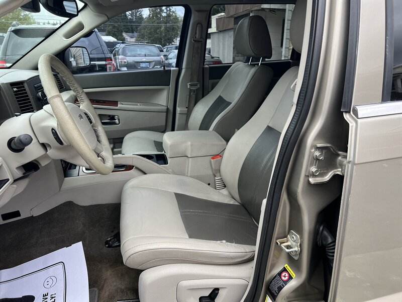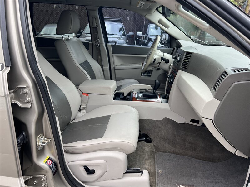 2005 Jeep Grand Cherokee Limited 4x4 powered by a 4.7L V8 producing 235 hp and 305 lb-ft of torque. Factory equipment includes leather-trimmed seating with power-adjustable, heated front seats, automatic climate control, remote keyless entry, power windows/locks/mirrors, cruise control and a factory AM/FM/CD premium audio system. Safety and convenience features include anti-lock brakes (ABS), traction control, front and side airbags, alloy wheels and the four-wheel-drive system. Exterior is Light Khaki Metallic Clearcoat with a Dark Khaki/Light Graystone interior; EPA fuel economy is 14 MPG city and 19 MPG highway. Vehicle is in excellent overall condition.