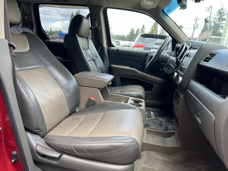 2006 Honda Ridgeline RTL AWD in Redrock Pearl with a gray leather interior, powered by a 3.0L naturally aspirated V6 (SOHC, 24V). Factory-equipped features include all-wheel drive, leather-trimmed heated front seats with power driver adjustments, power windows/locks/mirrors and remote keyless entry, cruise control and steering-wheel audio controls, an AM/FM/CD premium audio system, automatic climate control and a power moonroof. Safety and convenience items include ABS with traction control/Vehicle Stability Assist, front and side airbags with side-curtain protection, tire pressure monitoring, alloy wheels, a lockable in-bed trunk and fold-flat rear seating. Excellent overall condition, below 189,000 miles (averaging under 9,000 mi/yr), rated about 15 MPG city and 20 MPG highway.