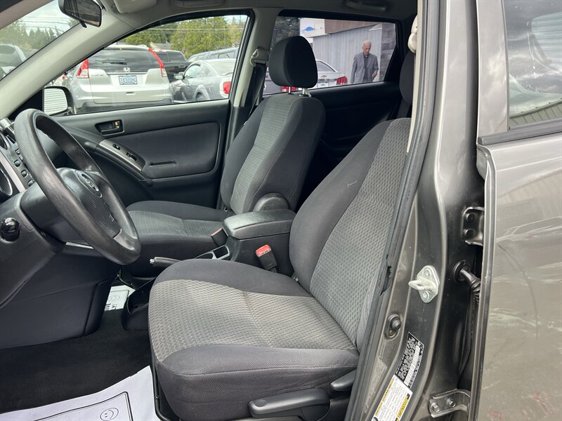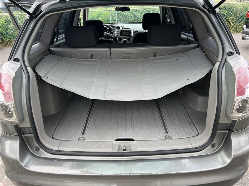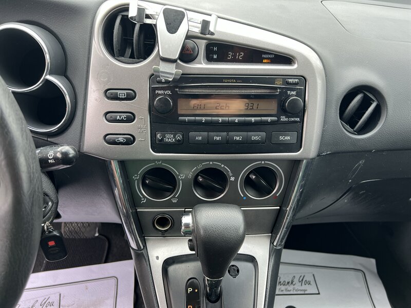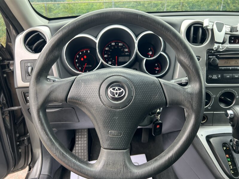 2006 Toyota Matrix in Black with Black interior, powered by a 1.0L naturally aspirated I4 DOHC 16V engine. Excellent overall condition with below 119,000 miles (averaging less than 6,000 miles per year) and strong fuel economy of 26 MPG city / 33 MPG highway. Factory-standard features include air conditioning, cloth seats, a 60/40 split-folding rear bench for flexible cargo space, power windows and door locks with remote keyless entry, tilt-adjustable steering column, cruise control, intermittent windshield wipers, and an AM/FM CD stereo; standard safety equipment includes front airbags and ABS. Practical, efficient, and well-maintained.