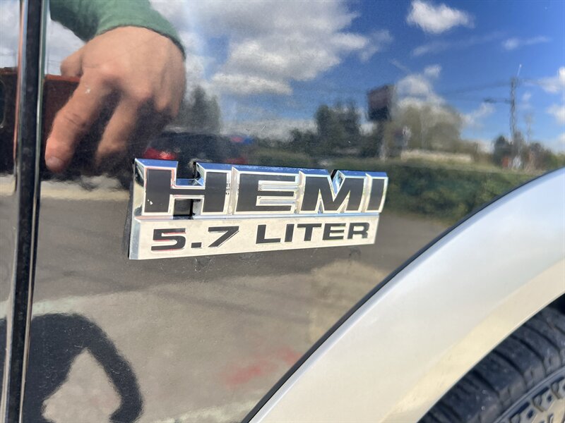 2009 Dodge Ram 1500 Laramie 4x4, powered by the HEMI 5.7L V8 (390 hp, 407 lb-ft), finished in Brilliant Black Crystal Pearl Coat with a Black interior; vehicle is in excellent overall condition. Factory equipment includes four-wheel drive with automatic transmission, anti-lock brakes, electronic stability and traction control, full frontal and side airbags, remote keyless entry, power windows/locks/mirrors, cruise control and steering-wheel audio controls, automatic climate control, leather-trimmed power front seats with heating, chrome exterior trim and alloy wheels, integrated towing package with wiring, and a premium AM/FM/CD audio system with auxiliary input. Fuel economy is rated at approximately 13 MPG city and 18 MPG highway.