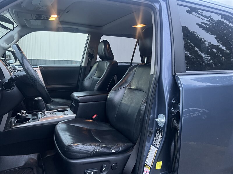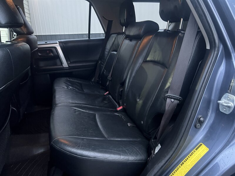2011 Toyota 4Runner Limited 4x4 in Blue with Black leather interior, powered by a 4.0L V6 producing 270 hp and 278 lb-ft mated to a 5-speed automatic (17 MPG city / 22 MPG highway). Factory-equipped Limited trim features leather-trimmed seating with heated front seats and a power-adjustable driver seat, dual-zone automatic climate control, multifunction steering wheel with audio/cruise controls, power windows/locks/mirrors and remote keyless entry. Infotainment and convenience include a factory center audio/head unit with Bluetooth hands-free and audio streaming plus auxiliary input, rear glass that opens independently for cargo access, roof rails and alloy wheels. Safety and chassis equipment include anti-lock brakes, vehicle stability control, traction control, front side airbags and full-length side curtain airbags; this example is in excellent overall condition.