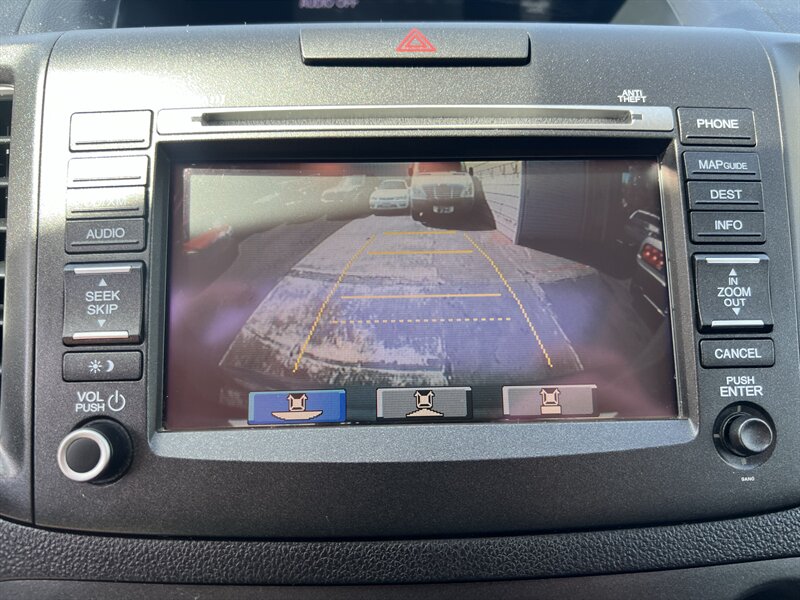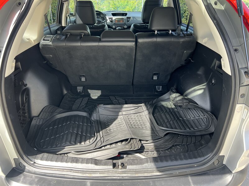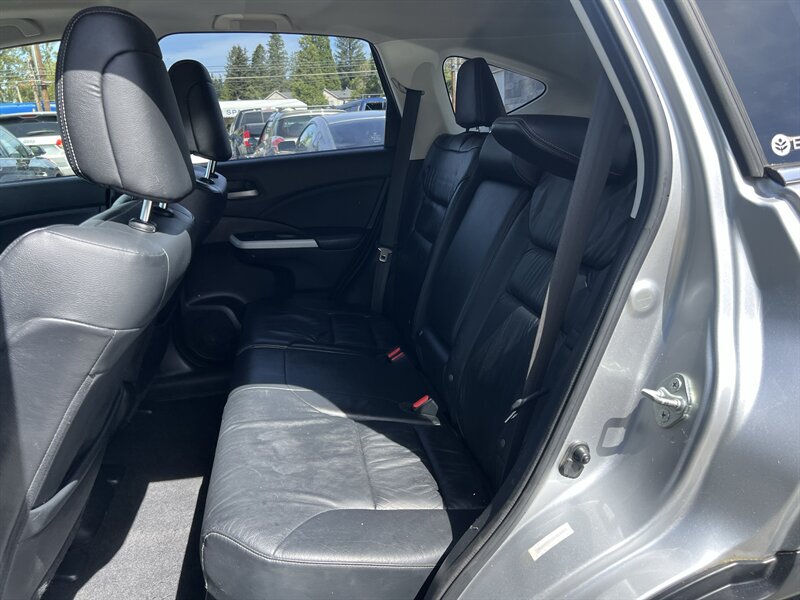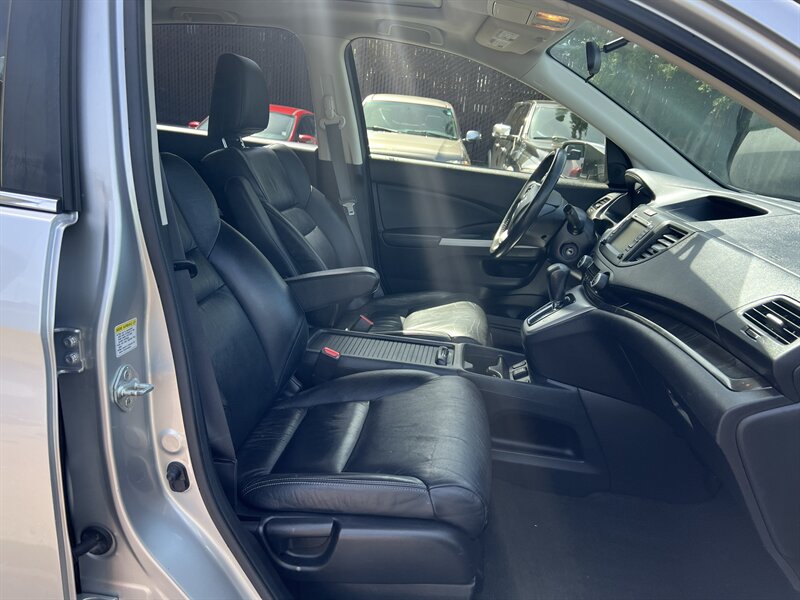 2012 Honda CR-V EX-L AWD in Alabaster Silver Metallic with a Black leather interior. Powered by a 2.4L I4 engine producing 185 hp and 163 lb-ft of torque; AWD, fuel economy rated at 22 MPG city and 30 MPG highway. Factory equipment includes leather-trimmed heated front seats with power-adjustable driver’s seat, power windows/locks/mirrors, a power moonroof, dual-zone automatic climate control, Bluetooth hands-free phone connectivity, AM/FM/CD audio with auxiliary/USB inputs and steering-wheel audio controls, roof rails, 60/40 split-folding rear seats, and alloy wheels. Standard safety features include ABS, Vehicle Stability Assist with traction control, front side and side-curtain airbags, and tire pressure monitoring. Vehicle has below 144,000 miles (averaging under 10,000 miles per year) and is in excellent overall condition.