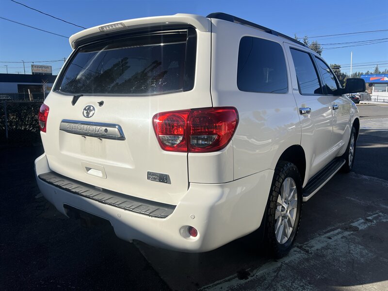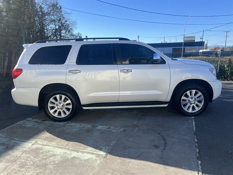 2014 Toyota Sequoia Platinum in Blizzard Pearl with Sand Beige interior, powered by a 5.7L V8 (381 hp, 401 lb-ft). Factory Platinum equipment includes leather seating with heated and ventilated front seats and power/memory adjustments, power-folding third row, power moonroof, multi-zone automatic climate control, factory navigation with Entune and premium JBL audio, Bluetooth/USB connectivity, rearview camera with front/rear parking sensors, blind-spot monitoring with rear cross-traffic alert, power liftgate, keyless entry and push-button start, 20-inch alloy wheels and the factory towing package. EPA-rated 13 city / 17 highway MPG; vehicle is in excellent overall condition.