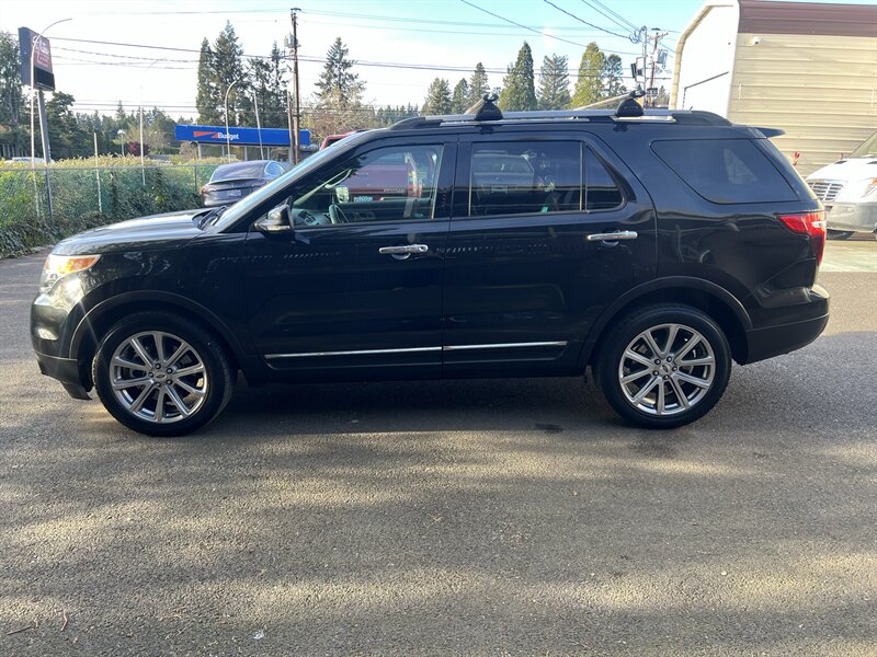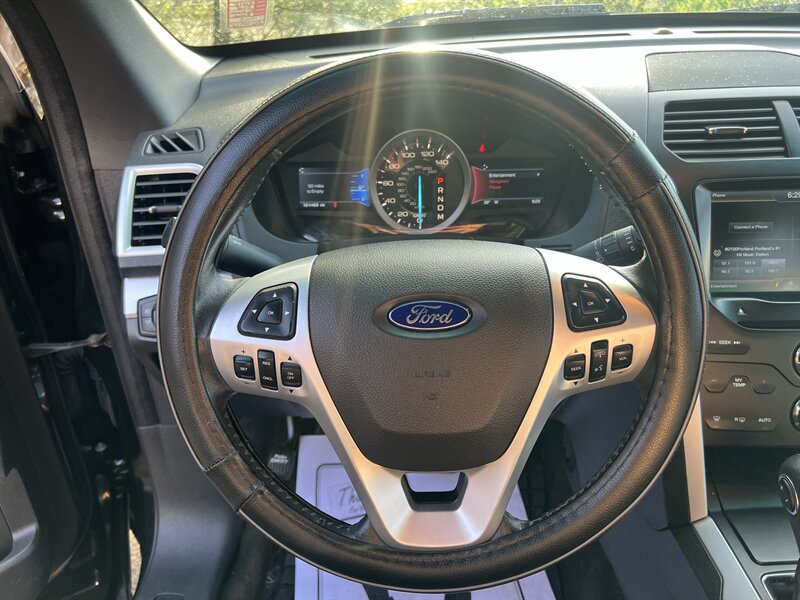 2015 Ford Explorer XLT 4x4 finished in Tuxedo Black Metallic with a Black interior, powered by a 3.5L V6 (290 hp, 255 lb-ft) and a 6-speed automatic — vehicle is in excellent overall condition. Factory equipment includes part-time four-wheel drive, three-row seating for up to seven, cloth upholstery, power windows and door locks, remote keyless entry, cruise control, tilt/telescoping steering wheel, steering-wheel audio controls, Ford SYNC with Bluetooth and USB/AUX inputs, AM/FM/CD audio, dual front airbags plus side-curtain airbags, ABS, traction control and stability control, alloy wheels and roof rails. Fuel economy is rated at 12 MPG city and 17 MPG highway.