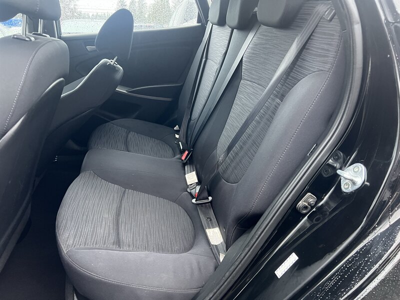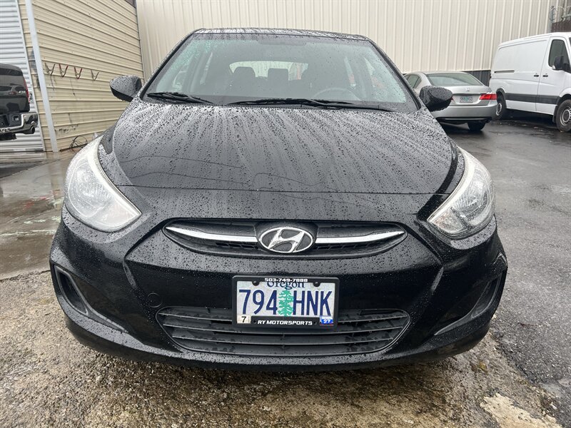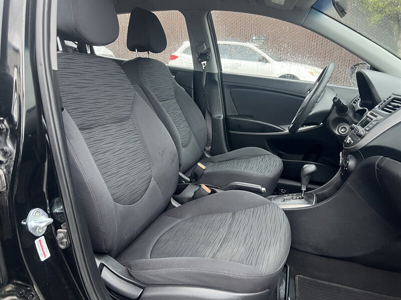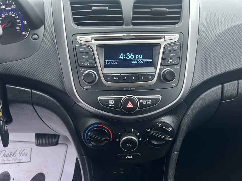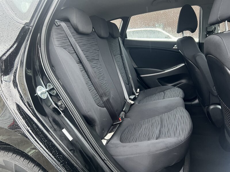 2015 Hyundai Accent GS with a 1.6L I4 engine producing 137 hp and 123 lb-ft of torque. Factory-standard features include air conditioning, gray cloth seating, power windows and door locks, power mirrors, remote keyless entry, AM/FM/CD/MP3 stereo with auxiliary and USB inputs, Bluetooth hands-free calling and audio streaming, steering-wheel audio controls, tilt steering column, 60/40 split-folding rear seat, ABS, electronic stability control, traction control, a full complement of airbags, tire-pressure monitoring and daytime running lights. Exterior is Ultra Black with a Gray interior, excellent overall condition, under 119,000 miles (averaging less than 10,000 miles per year), and EPA-rated at 27 MPG city / 38 MPG highway.