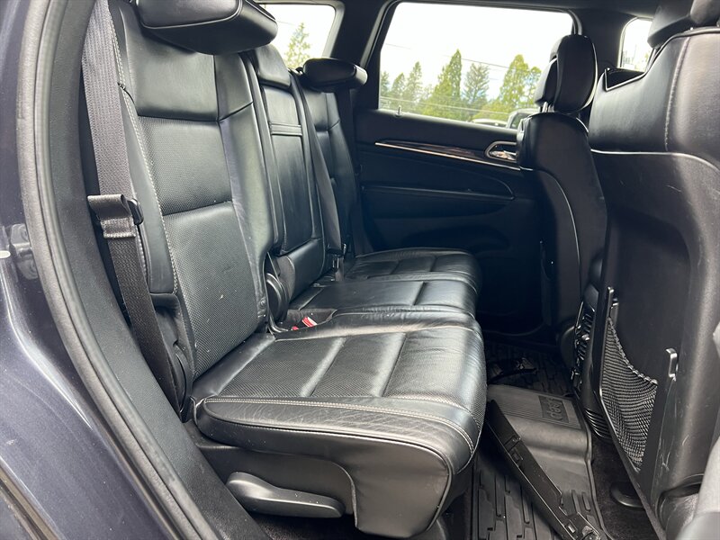 Factory-equipped features include a four-wheel-drive system with selectable terrain settings and an 8-speed automatic transmission, air suspension for adjustable ride height, Uconnect infotainment with a large touchscreen, Bluetooth phone and audio connectivity, premium leather seats with heated and ventilated front seats plus heated rear seats, heated steering wheel, power-adjustable front seats with driver memory, dual-zone automatic climate control, power liftgate, rearview camera with parking sensors, fog lamps and alloy wheels. Standard safety and convenience systems include ABS, traction and stability control, multiple airbags and tire pressure monitoring.