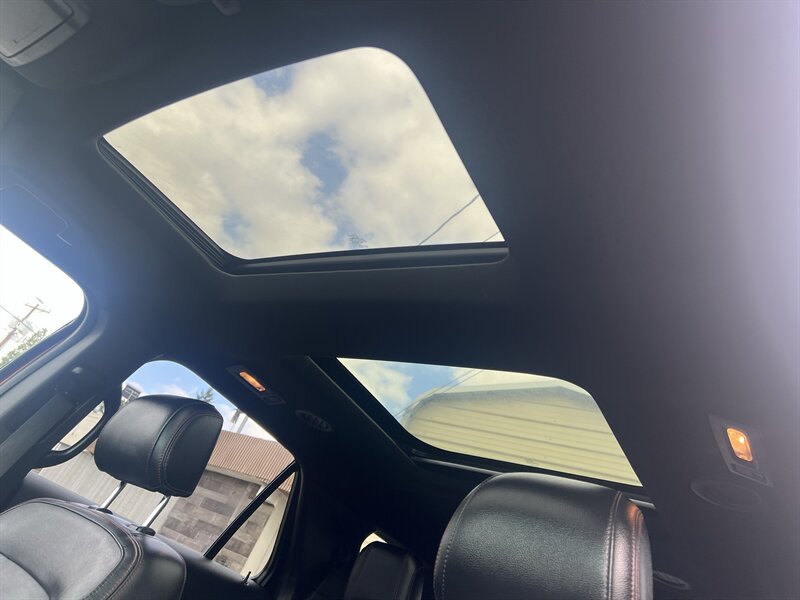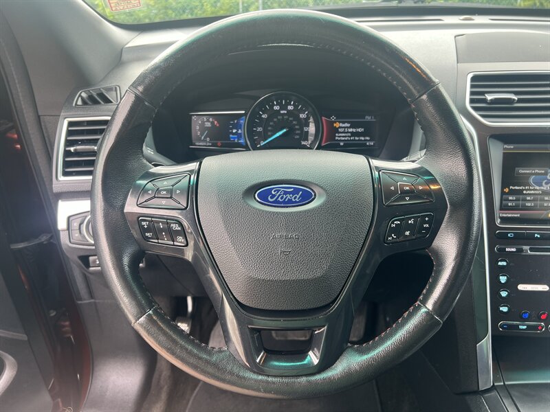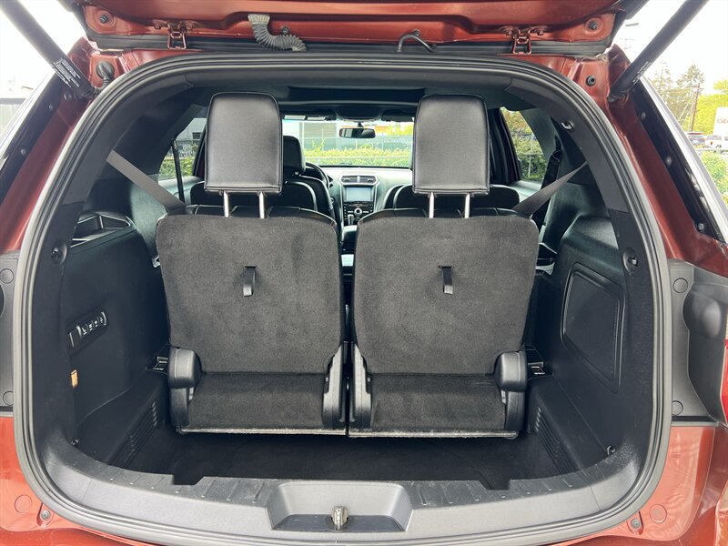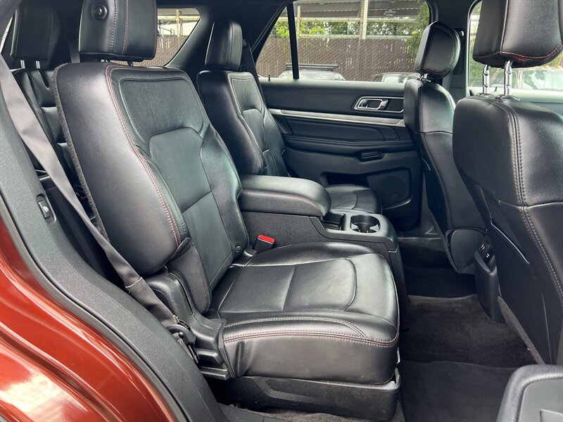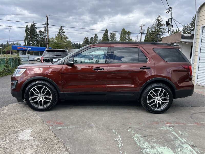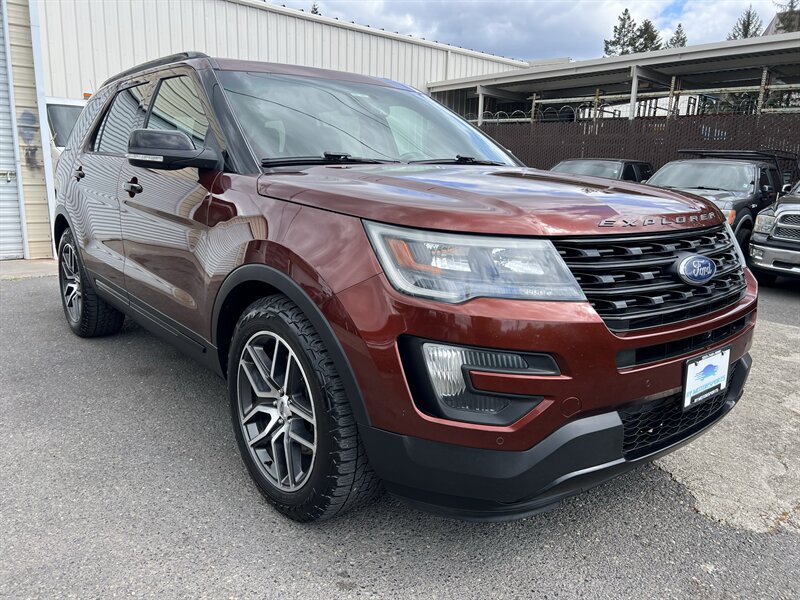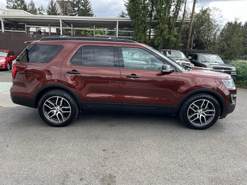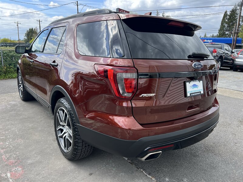 2016 Ford Explorer Sport 4WD powered by the EcoBoost 3.5L Twin-Turbo V6 (365 hp, 350 lb-ft) paired with an automatic transmission, rated at 16 MPG city / 22 MPG highway. Factory equipment on the Sport includes a sport-tuned suspension with performance-oriented brakes and exhaust, full-time 4WD, leather-trimmed sport seats with red accent stitching, heated and ventilated front seats, power-adjustable front seats, three-row seating, dual-zone automatic climate control, keyless entry with push-button start, Ford SYNC infotainment with Bluetooth and rearview camera, and standard safety systems such as multiple airbags, electronic stability control and traction control. Exterior is Bronze Fire Metallic Tinted Clearcoat with an Ebony Black interior with red accent stitching; the vehicle is in excellent overall condition.