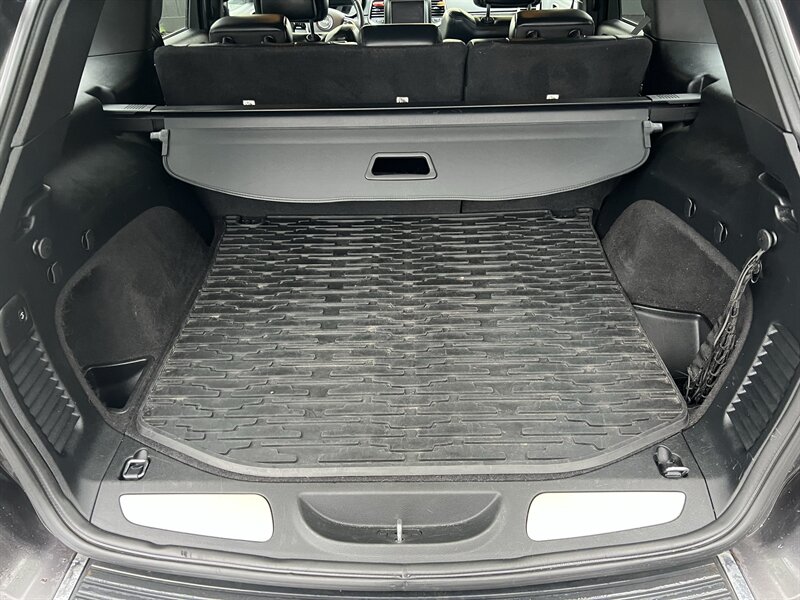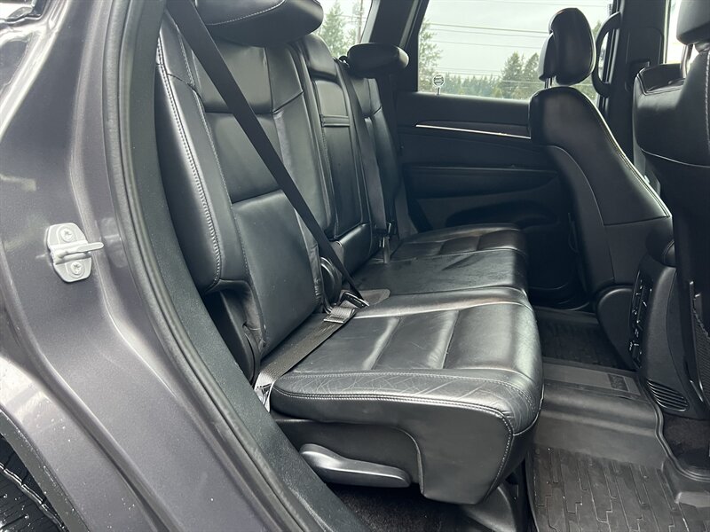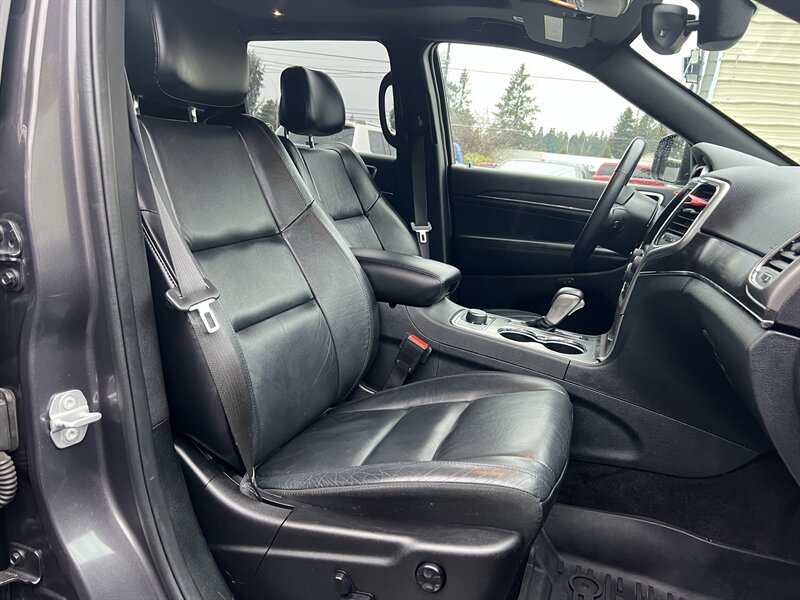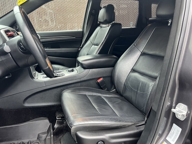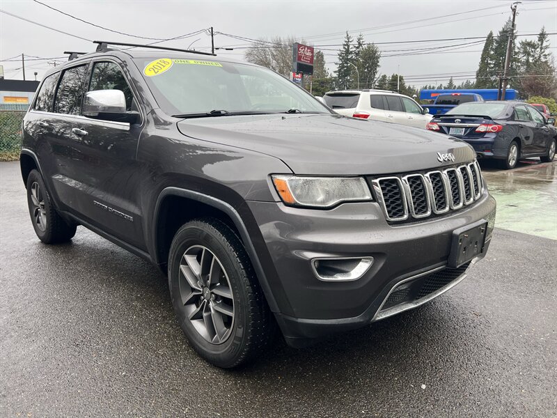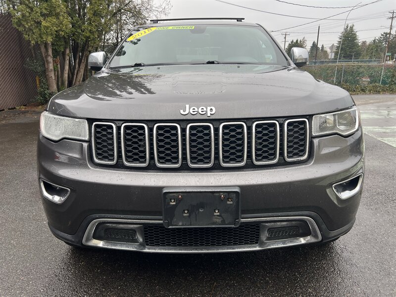 2018 Jeep Grand Cherokee Limited in Granite Crystal Metallic Clear Coat with a Black interior, powered by the Pentastar 3.6L V6 (295 hp, 260 lb-ft) paired with an 8-speed automatic transmission. Factory-standard features include leather-faced seating with heated front seats and power-adjustable driver seat, dual-zone automatic climate control, Uconnect infotainment with touchscreen, Bluetooth and USB connectivity, rearview camera, remote keyless entry and ignition, steering-wheel audio controls, alloy wheels, automatic headlights and full power accessories. EPA-rated 18 MPG city / 25 MPG highway; vehicle is in excellent overall condition.