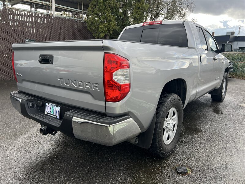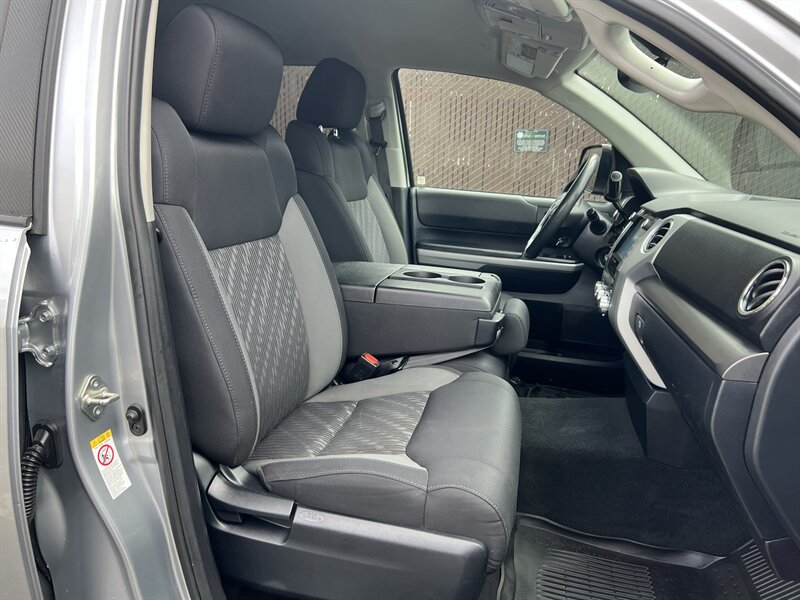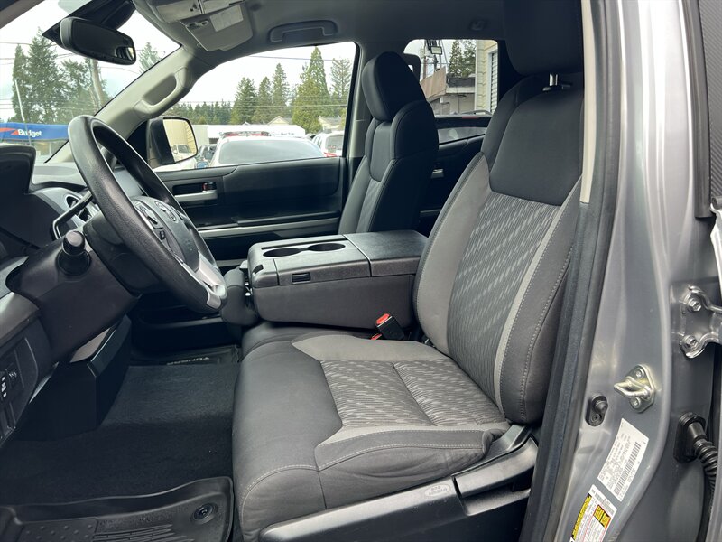 2020 Toyota Tundra SR5 4x4 in Silver Sky Metallic with a Black interior, powered by a 5.7L V8 producing 381 hp and 401 lb-ft of torque; fuel economy is approximately 13 MPG city / 17 MPG highway. Factory-standard features include four-wheel drive, cloth seating, power windows and door locks, remote keyless entry, steering-wheel audio and cruise controls, rearview camera, Bluetooth hands-free and audio streaming, AM/FM audio with USB/Aux inputs and a six-speaker system, air conditioning, ABS with traction and stability control, and a full complement of airbags; the vehicle is in excellent overall condition.